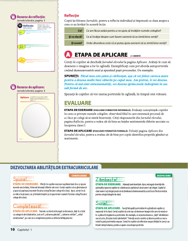 ETAPA DE APLICARE (EVALUARE FORMATIVĂ FORMALĂ). Folosiți pagina Aplicare din Jurnalul elevului, pentru a evalua cât de bine pot copiii identifica propriile gânduri și sentimente.