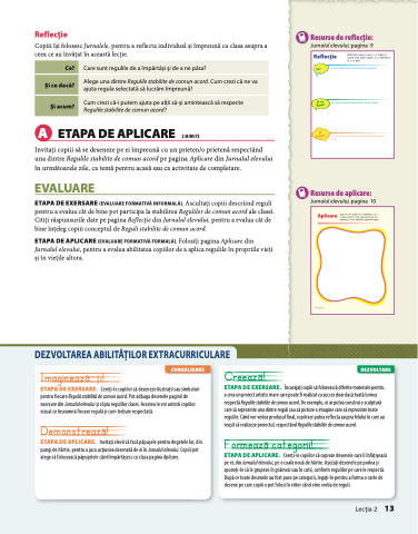 ETAPA DE APLICARE (EVALUARE FORMATIVĂ FORMALĂ). Folosiți pagina Aplicare din Jurnalul elevului, pentru a evalua abilitatea copiilor de a aplica regulile în propriile vieți și în viețile altora.