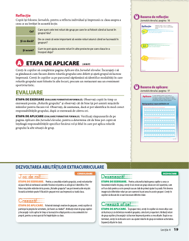 ETAPA DE APLICARE (EVALUARE FORMATIVĂ FORMALĂ). Verificați răspunsurile de pe pagina Aplicare din Jurnalul elevului, pentru a determina cât de bine pot copiii să înțeleagă responsabilitățile specifice fiecărui rol și felul în care pot aplica rolurile grupului la alte situații de grup.