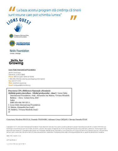 Copyright © 2017 Lions Clubs International Foundation. Toate drepturile rezervate. Nicio parte a acestei publicații nu poate fi reprodusă, stocată într-un sistem informatic sau transmisă în orice formă sau prin orice mijloc, electronic, mecanic, fotocopiere, înregistrare sau în alt mod, fără permisiunea scrisă, anterioară, a editorului. Acest program este disponibil doar împreună cu pregătirea specializată care îl însoțește. Abilități pentru Dezvoltare și Lions Quest precum și logourile distinctive și designul asociat cu fiecare dintre ele sunt mărci comerciale și de servicii ale LCIF și/sau ale partenerilor colaboratori. Finanțarea acestei ediții a fost asigurată parțial de un grand din partea NoVo Fundation.