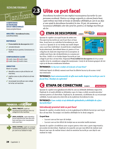 Spuneți-le copiilor să se gândească la felul în care au dobândit abilitatea respectivă. Explicați-le că unele abilități se dobândesc ușor, în timp ce altele necesită exercițiu/ exersare pentru a fi dezvoltate. Explicați-le, de asemenea, că abilitatea de a-și recunoaște calitățile, îi poate ajuta să se dezvolte și să-și păstreze încrederea în sine.