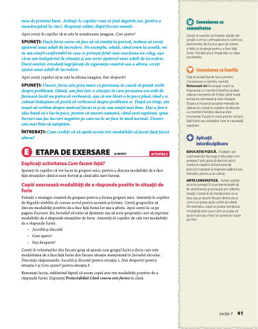 Folosiți o strategie creativă de grupare pentru a forma grupuri mici. Amintiți-le copiilor de Regulile stabilite de comun acord pentru această activitate. Cereți grupurilor să discute modalități pozitive de a face față furiei lor sau a altora. Apoi cereți-le ca pe pagina Exersare din Jurnalul elevului să deseneze sau să scrie propoziții care să exprime modalități de a răspunde situațiilor de furie. Amintiți-le copiilor de cele trei modalități de a răspunde furiei:
