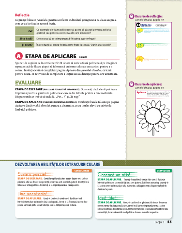 Spuneți-le copiilor ca în următoarele 24 de ore să scrie o frază politicoasă pe imaginea reprezentată de floare și apoi să folosească creioane colorate sau carioci pentru a o colora. Invitați elevii să completeze pagina Aplicare din Jurnalul elevului, ca temă pentru acasă, ca activitate de completare a lecției sau ca discuție pentru ora următoare.