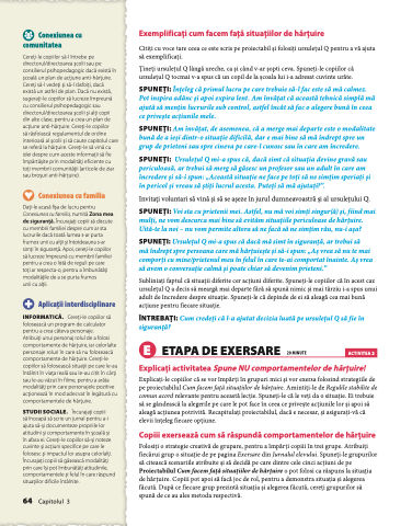 Folosiți o strategie creativă de grupare, pentru a împărți copiii în trei grupe. Atribuiți fiecărui grup o situație de pe pagina Exersare din Jurnalul elevului. Spuneți-le grupurilor să citească scenariile atribuite și să decidă pe care dintre cele cinci acțiuni de pe Proiectabilul Cum facem față situațiilor de hărțuire o pot folosi ca răspuns la situația de hărțuire. Copiii pot apoi să facă joc de rol, pentru a demonstra situația și alegerea făcută. După ce fiecare grup prezintă situația și alegerea făcută, cereți grupurilor să spună de ce au ales metoda respectivă.