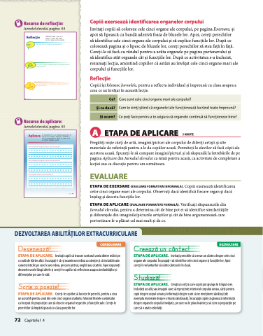 ETAPA DE APLICARE. Creați un colț la care copiii pot ajunge în timpul orei. Includeți un afiș sau imagini care să reprezinte interiorul corpului uman, cărți pentru copii despre corpul uman și informații despre cum să ne menținem sănătoși (de exemplu materiale despre o hrană sănătoasă). Încurajați copiii să găsească informații despre organele corpului învățate, pe care nu le știau înainte și să scrie o propoziție pe care să o arate celorlalți.