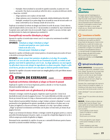 ARTE LINGVISTICE. Formați perechi și invitați un copil să fie „Gândește!” și altul să fie „Alege!” Spuneți-le că vor ajuta niște copii să ia deciziile corecte. Prezentați scenarii ca cel de mai jos. Apoi întrebați copiii care sunt „Gândește!” care sunt opțiunile și pe cei care sunt „Alege!” pe care dintre opțiuni ar alege-o.