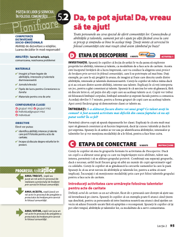 de învățare prin servicii în folosul comunității, care li se potrivește cel mai bine. Dați exemple, pe care le-ați pregătit în avans, de imagini și fraze care descriu unele dintre abilitățile, interesele și talentele dumneavoastră. Cereți-le copiilor să ridice mâna dacă și ei au oricare dintre aceste abilități, interese sau talente. Explicați-le că veți interpreta un joc, pentru a găsi conexiuni și talente. Spuneți-le că sarcina lor este să găsească, fără să discute între ei, cel puțin doi alți copii care au aceleași talente ca ei. Copiii vor trebui să folosească limbajul corpului, limbajul semnelor și expresii faciale pentru a comunica. Acordați elevilor 5-7 minute, pentru a forma grupuri de copii care au aceleași talente. Apoi cereți fiecărui grup să demonstreze clasei ce talente au.