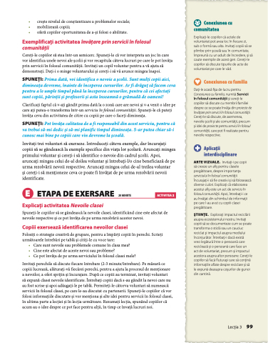 să expună clasei nevoile identificate. Întrebați copiii dacă s-au gândit la nevoi care nu au fost scrise și apoi adăugați-le pe tablă. Permiteți-le câtorva voluntari să numească servicii în folosul clasei, pe care le-au discutat cu partenerii. Spuneți-le copiilor că vor folosi informațiile discutate și vor menționa și alte idei pentru servicii în folosul clasei, în ultima parte a lecției și în lecția următoare. Rezumați lecția, spunând copiilor că acum au o idee despre ce pot face pentru alții, în timp ce învață lucruri noi.